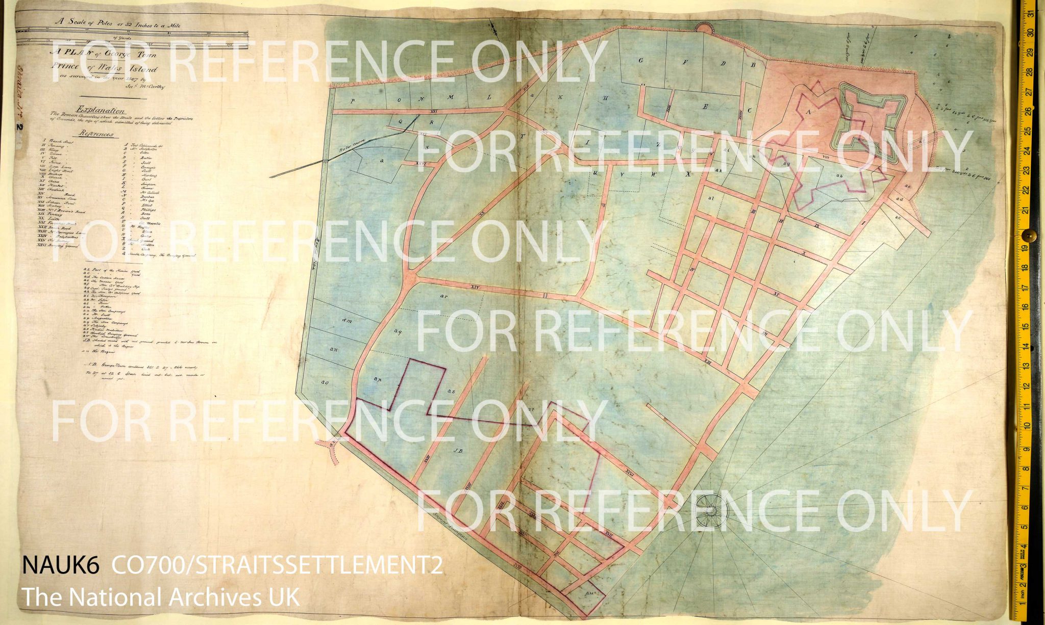 | Features: | A Plan of George Town, Prince of Wales’ Island, as surveyed in the year 1807, by Jeremiah McCarthy [George Town]. (Tracing.) Showing Prangin Ditch, Bounds Ditch and Fort Cornwallis |