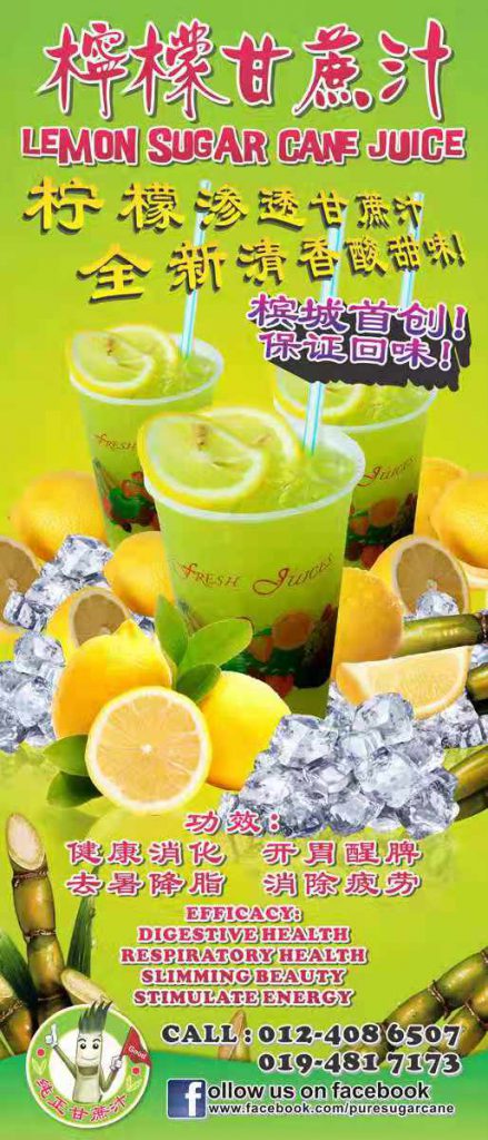 Their homemade sugar cane drinks are available in night markets throughout Penang Island such as Macallumm, Tanjung Bungah, Pantai Jerejak and Karpal Singh Drive. The drinks are sold from a food truck.